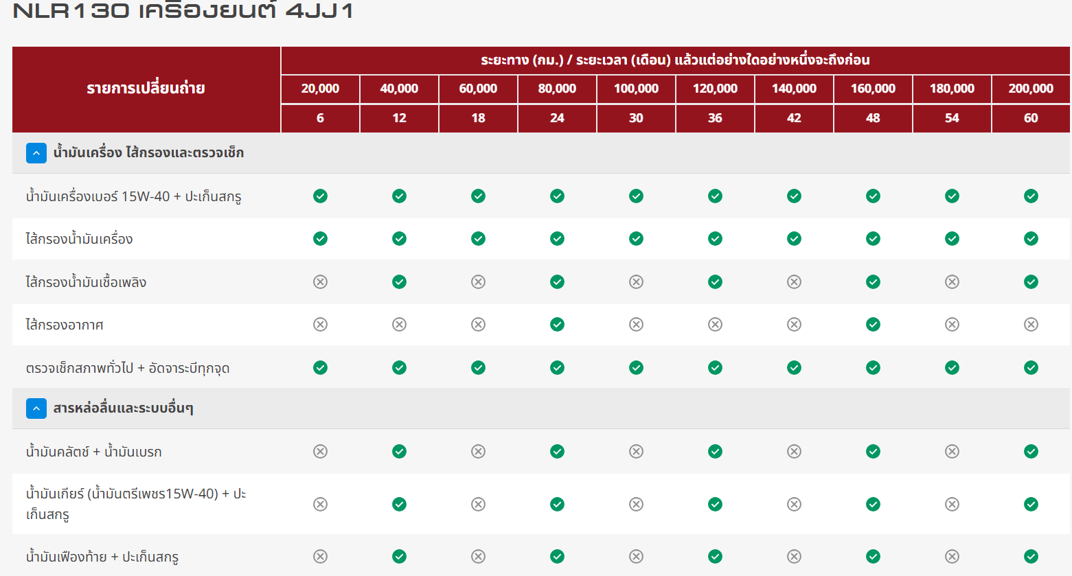 จากตารางที่ได้รับ รถบรรทุก Isuzu NLR เครื่องยนต์ 4JJ1 มีตารางการซ่อมบำรุงในแต่ละระยะทางและระยะเวลา ดังนี้: