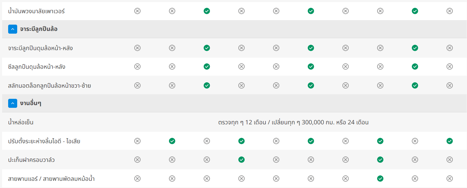 • น้ำหล่อเย็น: ตรวจเช็คทุก 12 เดือน / เปลี่ยนทุก 300,000 กม. หรือ 24 เดือน